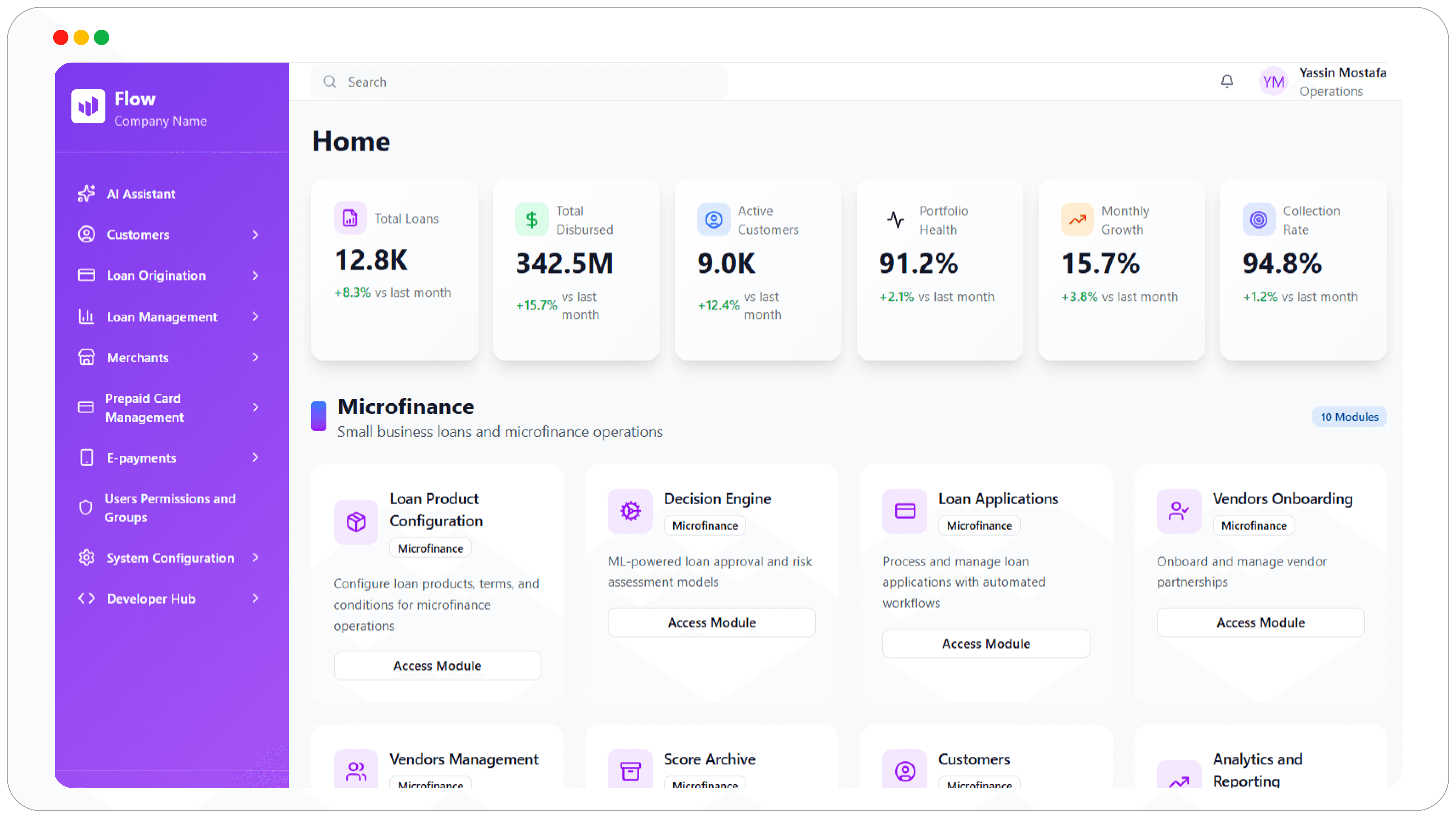 FlowCore Connects to FlowSuite (loan lifecycle). Works with Decision Engines for approvals. Integrates payment providers, AML systems, and credit bureaus.