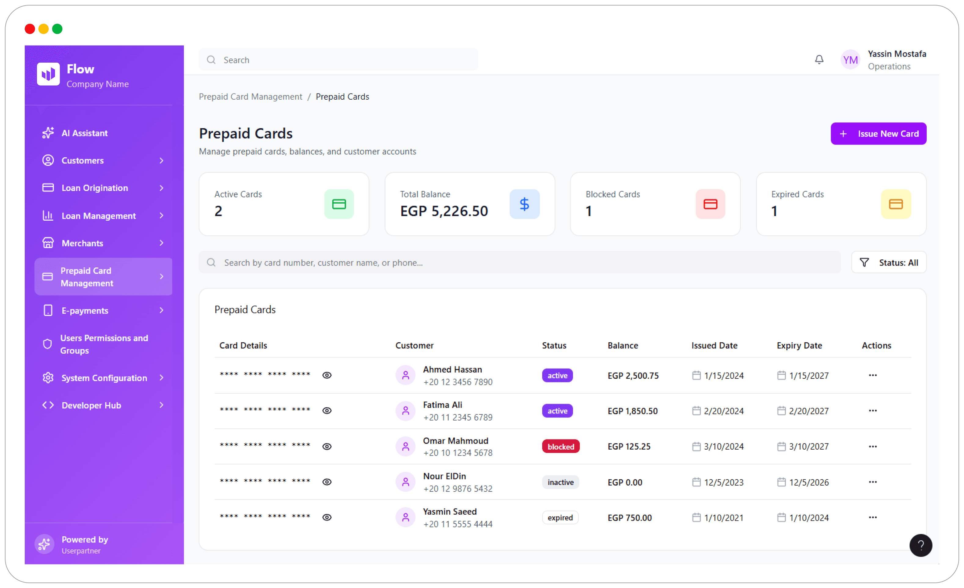 Flow’s Prepaid Card Management system empowers institutions to offer digital and physical prepaid cards linked to customer accounts.